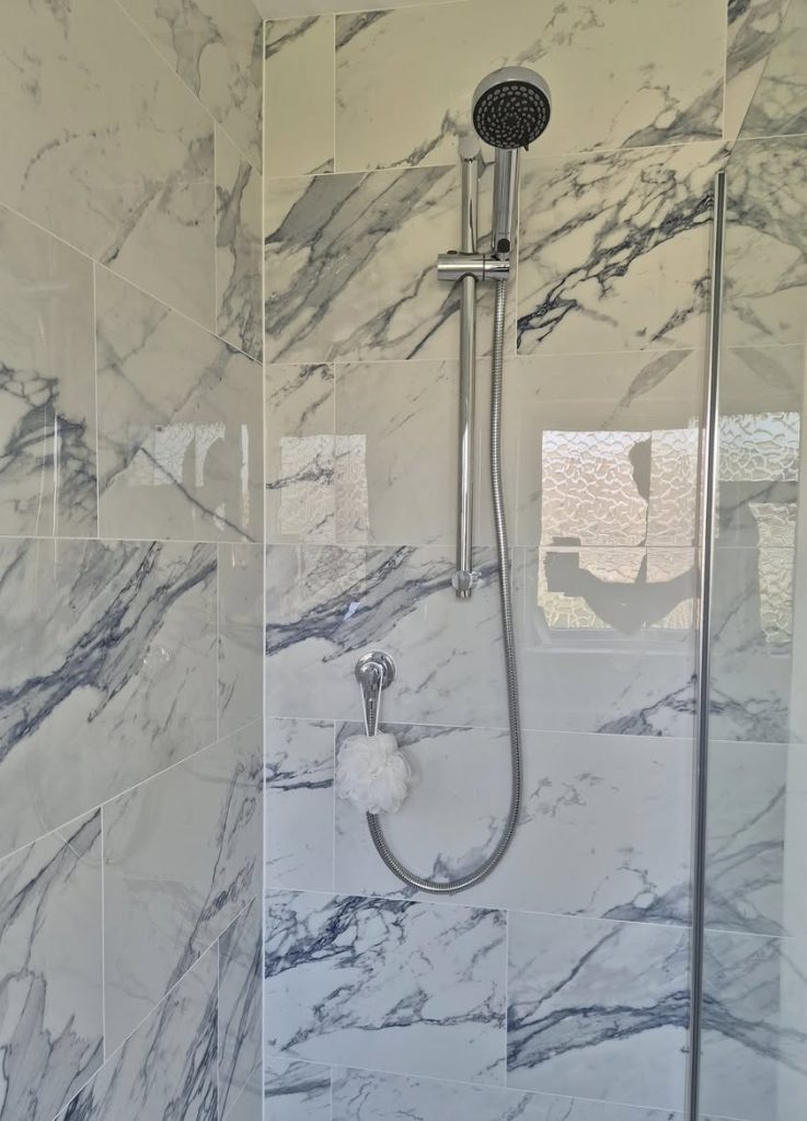 Gone is the great big floor to ceiling box in the corner that housed the soil vent pipe, and in went a Durgo valve. This meant a whole new usable box went in at the end of the lovely walk-in shower, providing an area for the shower products to stand.