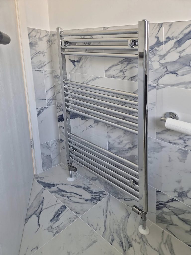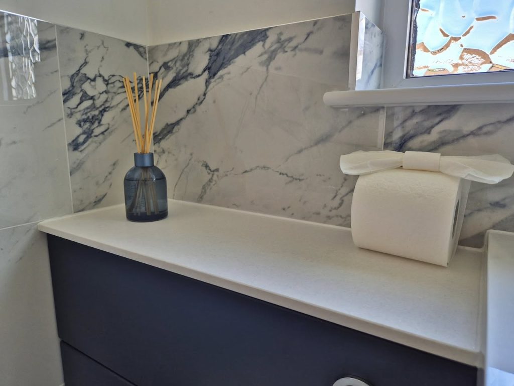 Furniture for storage and the hiding of unsightly pipework worked beautifully, and the room tiled with large elegant marble effect porcelain tiles finished it all off.